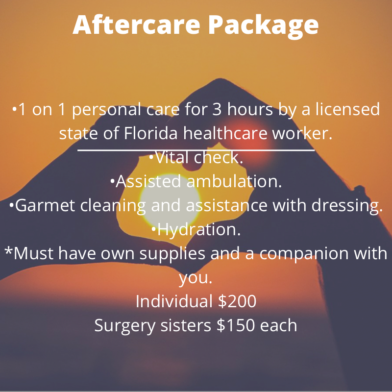 Client will receive 1 on 1 personal care by a Florida state certified healthcare personnel, garmet cleaning, assistance with dressing, vital check, and signature hydration drink. $200 for individual, $150 for surgery sisters *Must receive service on same day and same location as surgery sister.
